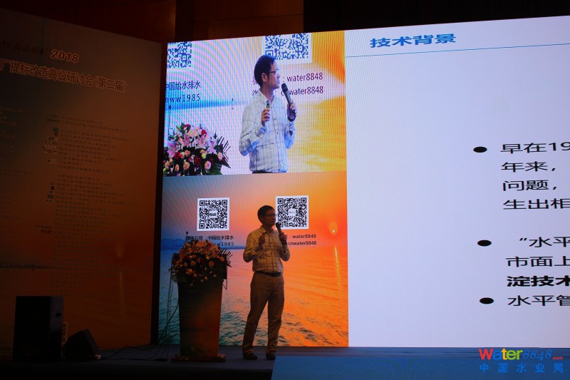 頒獎儀式過后,進入2018年水平管高效沉淀技術(shù)專題研討環(huán)節(jié)。首先由上海市政工程設(shè)計研究總院安徽分院夏煒院長對于水平管高效沉淀池在水處理工程中的綜合應(yīng)用進行了闡述。上海市政工程研究總院安徽分院在設(shè)計了國禎環(huán)保“合肥1.5萬噸/日污水處理廠”的項目,沉淀池技術(shù)使用水平管高效沉淀池。夏院長指明水平管高效沉淀池是現(xiàn)今為止最能體現(xiàn)“淺池理論”優(yōu)勢的沉淀池產(chǎn)品,是沉淀技術(shù)的重大突破,并對水平管與傳統(tǒng)的高效沉淀池在行業(yè)中的應(yīng)用進行了分析對比。(配圖:演講)