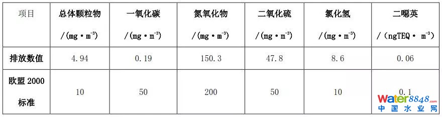 目前本工程已經(jīng)通過性能考核測試,進入為期1年的委托運行期。性能考核期間,危廢污泥平均進泥含水率約78%,平均危廢污泥處理量為57.26t/d(折合絕干值為12.6tDS/d,高于設(shè)計值12tDS/d)。該工程性能考核期間主要煙氣排放指標與設(shè)計煙氣排放標準歐盟2000對比詳見表1。