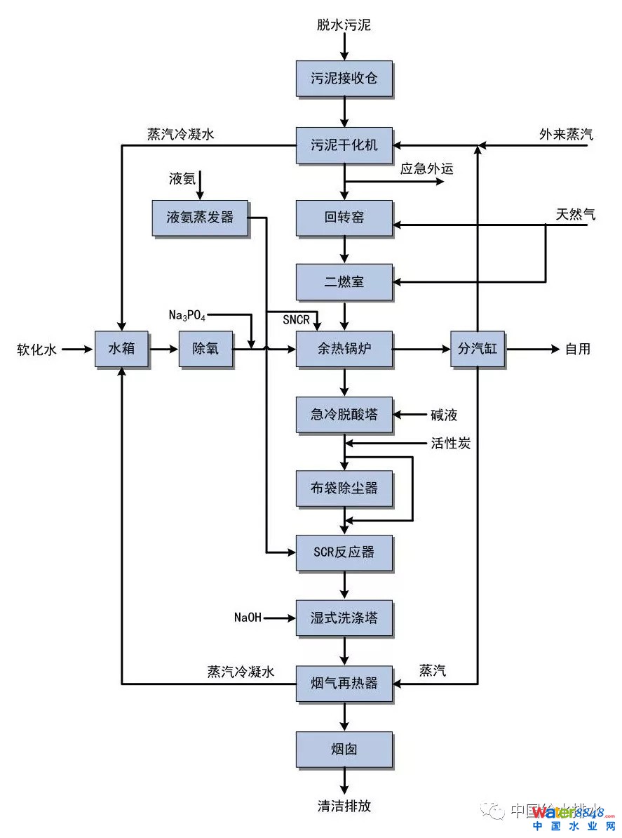 該工程主要設(shè)置濕污泥接收系統(tǒng)、污泥干化系統(tǒng)、污泥焚燒系統(tǒng)、余熱利用系統(tǒng)和煙氣凈化系統(tǒng)。