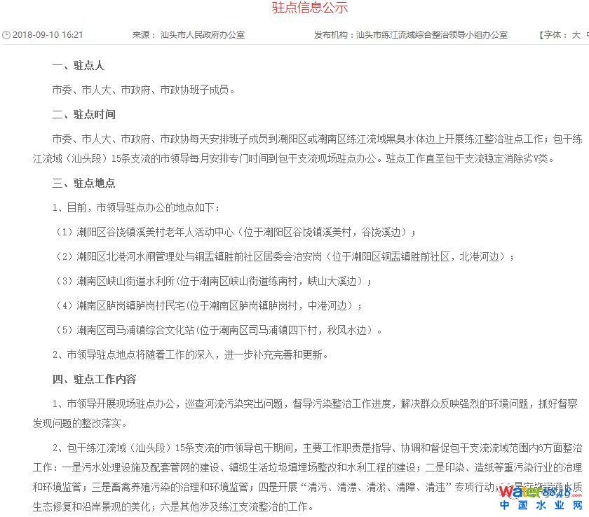 “政事兒”(微信ID:xjbzse)注意到,此番汕頭市練江流域綜合整治領(lǐng)導(dǎo)小組辦公室此番發(fā)布的駐點(diǎn)信息,明確駐點(diǎn)人為“市委、市人大、市政府、市政協(xié)班子成員”,“市委、市人大、市政府、市政協(xié)每天安排班子成員到潮陽(yáng)區(qū)或潮南區(qū)練江流域黑臭水體邊上開展練江整治駐點(diǎn)工作”。