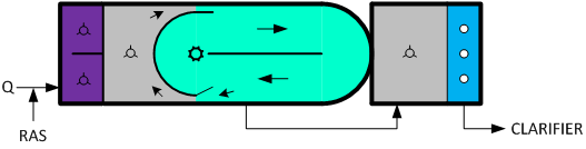 如前所述,卡魯塞爾氧化溝最明顯的特征是以立式低速表曝機(jī)取代水平軸表曝機(jī),這樣做的工藝背景是使曝氣區(qū)基本接近完全混合反應(yīng)器的流態(tài),曝氣區(qū)下游的長渠道則基本接近推流反應(yīng)器模型的流態(tài)。因此卡魯塞爾氧化溝實(shí)際上是將兩種反應(yīng)器模型的優(yōu)勢結(jié)合在一起,既可利用長溝道進(jìn)行較為徹底的生化反應(yīng),還能借助完全混合區(qū)的攪拌、緩沖能力化解水質(zhì)負(fù)荷的變化,具有較強(qiáng)的抗沖擊負(fù)荷能力。從現(xiàn)在的工藝觀點(diǎn)來看,這樣做帶來的另外一個(gè)好處就是在渠道下游形成的缺氧區(qū)還可以觸發(fā)反硝化反應(yīng)。如下圖所示。