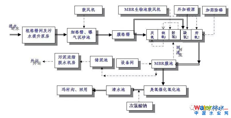 按照對各種主要出水指標的工藝方案的分析,結(jié)合實際工程的特點,按照現(xiàn)在社會影響普遍能夠接受的方式,設(shè)計了地下處理廠,采用MBR工藝,此工藝是多級AO+MBR+臭氧+高級氧化工藝流程。