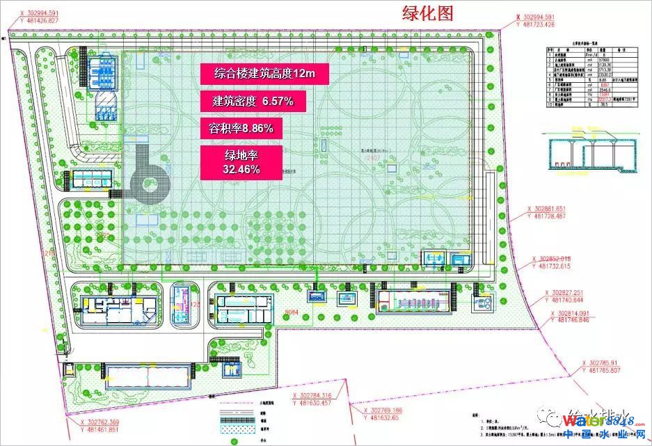 工程為8萬噸處理規(guī)模,占地面積5.79公頃,整個處理廠地下部分地下部分2.66公頃其他為地上部分。整個處理廠地下部分最深的地方埋深在16米,建好的地下部分,地下廠的上面有一米多的覆土,它的整體地方,整個廠的綠化率,如果不算廠的部分是32%的綠化率。