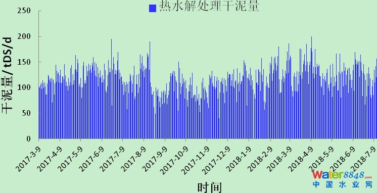 熱水解共3條生產(chǎn)線,日常運轉(zhuǎn)2條生產(chǎn)線,平均日處理量為117tDS/d,為設(shè)計負荷(180tDS/d)的65%。