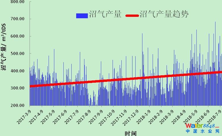 沼氣產(chǎn)氣量大于350m3/tDS,超過設(shè)計值222m3/tDS。