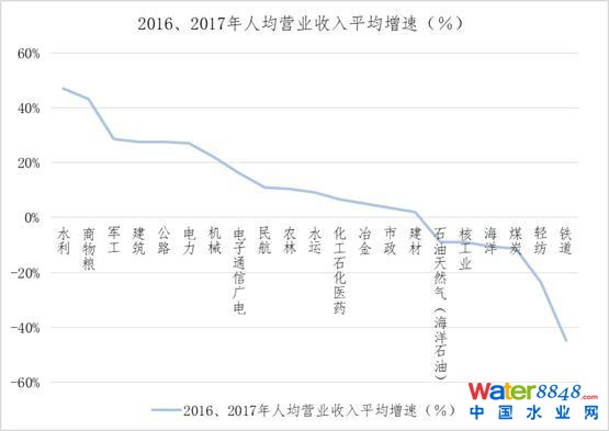 電力、公路、機(jī)械、水利、商物糧、民航、建筑和農(nóng)林8個(gè)行業(yè)人均營業(yè)收入都保持著穩(wěn)步增長的態(tài)勢(shì)。在上述人均產(chǎn)值連續(xù)兩年增長的8個(gè)細(xì)分行業(yè)中,從增速來看,水利、商物糧表現(xiàn)最為突出,2016、2017年人均營業(yè)收入平均增長率超過40%。從規(guī)模來看,2017年電力行業(yè)以214萬元人均營業(yè)收入位列第一,其次為公路行業(yè)170萬元,機(jī)械行業(yè)為150萬元,水利行業(yè)為103萬元,這些行業(yè)2017年的人均營業(yè)收入都超過了百萬規(guī)模。除了農(nóng)林行業(yè)人均營業(yè)收入26萬元外,其他增長性行業(yè)比如商物糧、民航、建筑人均產(chǎn)值規(guī)模也不低, 2017年分別達(dá)到了94萬元、87萬元、79萬元。
