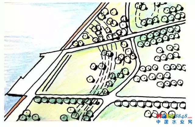 在濱水景觀設(shè)計(jì)中,既要突出水景的處理,又要重視原始地形的地表肌理,盡量保持原有地形地貌,還應(yīng)理順各造景元素之間的關(guān)系。
