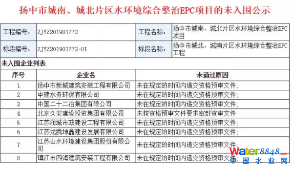 中國水網(wǎng)獲悉,近日,揚(yáng)中市東片區(qū)水環(huán)境綜合整理EPC項(xiàng)目和揚(yáng)中市城南、城北片區(qū)水環(huán)境綜合整理EPC項(xiàng)目發(fā)布資格預(yù)審結(jié)果公告。有意思的是,資審結(jié)果顯示,不少企業(yè)因未按時(shí)遞交資深文件等理由未入圍。