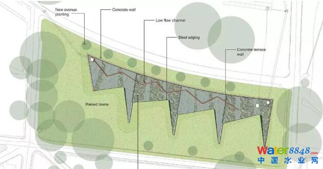 經(jīng)過設(shè)計,整個的雨水花園每年將吸收16,000公斤的固體懸浮顆粒,同時通過植物生長吸收160公斤的營養(yǎng)鹽、氮等一些元素,減少垃圾產(chǎn)量。同時地下存水的過濾水將達200千升,提供每年公園所需灌溉水的60%。