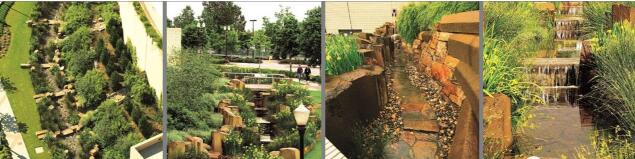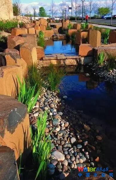波特蘭位于美國的西北部,受季風(fēng)氣候影響,是一個多雨城市,解決過多的雨水問題就成了波特蘭市的首要問題。由邁耶·瑞德景觀建筑事務(wù)所設(shè)計的波特蘭會議中心的“雨水園”,成功的解決了雨水排放和初步凈化處理問題。設(shè)計師利用當(dāng)?shù)厮、植物根系、沙石以及土壤特性,將渾濁的雨水進行凈化、沉淀,經(jīng)過過濾干凈清潔的水透過土壤被下滲到土地下,解決了雨水排放和過濾問題,同時還創(chuàng)造了美景。