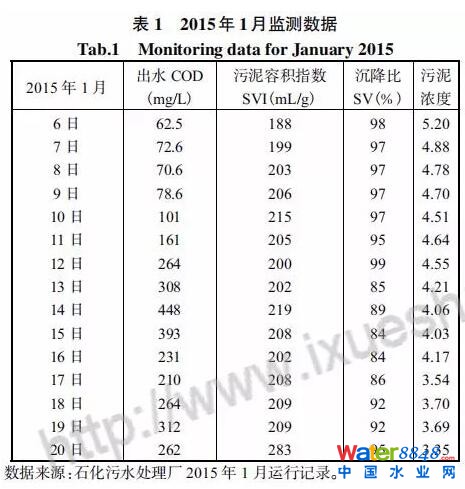 2015年1月由于前方廠生產(chǎn)裝置出現(xiàn)事故,一定量高濃度廢水從原有的高濃度污水管線轉(zhuǎn)移到生活管線排放,雖然進水COD沒有明顯增大,但因缺少預處理,部分難降解有機物對純氧曝氣活性污泥有較大的影響,具體數(shù)據(jù)見表1。
