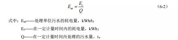 企業(yè)在一定計量時間內(nèi)處理單位污水需要消耗的用電量,耗電量僅計算處理污水達到要求的排放標準時所消耗的電量,不含再生利用過程消耗的電能(同時包括辦公使用的耗電量,不包括基建、生活用耗電量等)。按公式6-2計算: