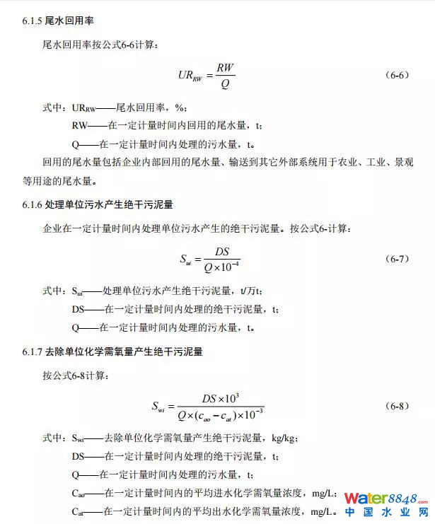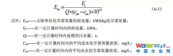 企業(yè)在一定計量時間內(nèi)處理單位化學需氧量需要消耗的用電量,耗電量僅計算處理污水達到要求的排放標準時所消耗的電量,不含再生利用過程消耗的電能(同時包括辦公使用的耗電量,不包括基建、生活用耗電量等)。按公式6-3計算: