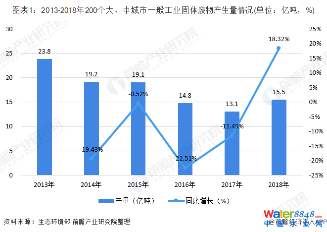 根據(jù)生態(tài)環(huán)境部發(fā)布的《2019年全國(guó)大、中城市固體廢物污染環(huán)境防治年報(bào)》,2018年,200個(gè)大、中城市一般工業(yè)固體廢物產(chǎn)生量達(dá)15.5億噸,較2017年產(chǎn)量同比增長(zhǎng)18.32%。