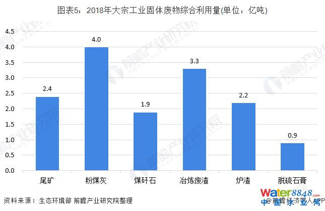 根據(jù)生態(tài)環(huán)境部統(tǒng)計(jì)數(shù)據(jù),2018年大宗工業(yè)固體廢物綜合利用量分別為尾礦2.4億噸、粉煤灰4.0億噸、煤矸石1.9億噸、冶煉廢渣3.3億噸、爐渣2.2億噸、脫硫石膏0.9億噸。