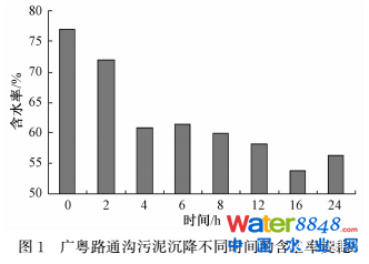 由圖1、圖2可知,通溝污泥經(jīng)過(guò)一定時(shí)間的自然沉降,污泥含水率逐步降低,一般通溝污泥經(jīng)過(guò)24h左右的沉降含水率可降至70.0%以下,表明通溝污泥可以通過(guò)重力濃縮進(jìn)一步降低含水率,有利于通溝污泥的轉(zhuǎn)運(yùn)和處置。