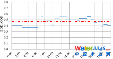 (5)被測(cè)試樓宇居民生活污水的BOD5/COD、BOD5/NH3-N、BOD5/TN和BOD5/TP日均濃度比值分別為0.47、5.71、3.27、34.82,其中BOD5/COD波動(dòng)不明顯,最大值與最小值的比值僅為1.63,而BOD5/NH3-N、BOD5/TN和BOD5/TP波動(dòng)較明顯,均在08:30—20:30時(shí)段出現(xiàn)相對(duì)較大值,其他時(shí)段比值相對(duì)較小。
