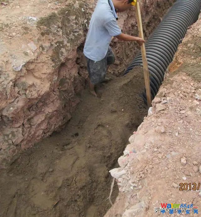管溝的溝底層應是原土層,或是夯實的回填土,溝底應平整,坡度應順暢,不得有尖硬的物體、塊石等。管溝開挖應放坡,堆土不得靠近管溝。如溝基為巖石、不易清除的塊石或為礫石層時,溝底應下挖100~200mm,填鋪細砂或粒徑不大于 5mm 的細土,夯實到溝底標高后,方可進行管道敷設。排水管道在封土前,其管道接頭兩端應該采取砂漿磚塊的固定措施。無冰凍地區(qū)給水管道管頂的覆土埋深不得小于 500mm,穿越道路( 含路面下) 部位的管頂覆土埋深不得小于 700mm。