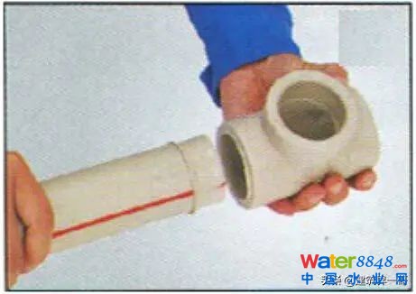 將管子筆直地插入擠壓式管件內,注意不要碰傷橡密封圈,并確認管件端部與畫線位置的距離,公稱直徑 10~25mm 時為3mm;公稱直徑 32~100mm 時為5mm