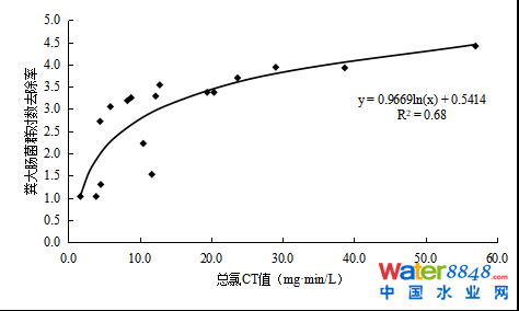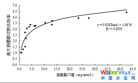 圖5 游離氯CT值與糞大腸菌群對數(shù)去除率的相關性