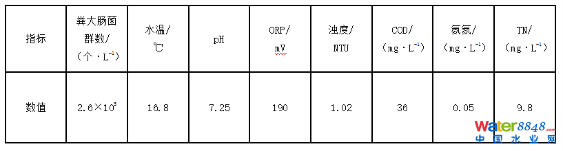 采集加氯點前二沉池出水20 L作為試驗用水,檢測糞大腸菌群數(shù)、ORP、氨氮、TN、COD、濁度、pH、水溫等水質(zhì)指標。