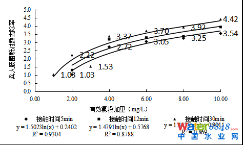 ORP可以反映溶液的氧化還原性。其值越高,溶液的氧化性越強;反之,其值越低,溶液的還原性越強。有文獻報道了ORP值與氯對一些微生物和細菌的殺滅效果高度相關。本研究表明,糞大腸菌群對數(shù)去除率與反應后水樣的ORP值呈現(xiàn)較好的對數(shù)相關性,如圖3所示,接觸時間5、12、30 min的相關系數(shù)(R)值分別為0.8680、0.7971、0.8706,推測出現(xiàn)這一相關性正是由于水中投加了次氯酸鈉這類氧化劑后,引起水質(zhì)的氧化還原電位發(fā)生了改變?紤]到糞大腸菌群數(shù)等致病微生物指標的檢測周期一般需要48h,目前部分歐美發(fā)達國家已普遍采用ORP值控制泳池水的消毒效果。因此為簡單快速預判污水處理廠出水糞大腸菌群的去除效果,建議在出水排放口處安裝在線ORP儀以輔助判斷消毒效果。