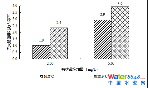 試驗水樣中有效氯投加量為2 mg/L和5 mg/L時,分別在水溫為16.8 ℃和28.9 ℃下接觸消毒5 min,結(jié)果如圖6所示,可見水溫對糞大腸菌群對數(shù)去除率有顯著影響。在相同的有效氯投加量下,水溫升高可明顯提高糞大腸菌群對數(shù)去除率,這可能是由于溫度的提升使得次氯酸擴散至微生物表面的速率變快,進而提高了穿透細胞壁發(fā)生氧化作用使其死亡的概率。因此在為了達到近似的糞大腸菌群對數(shù)去除率的前提下,夏季水溫較高時可適當減少次氯酸鈉的投加量;而在冬季水溫較低的環(huán)境下,可通過加大有效氯投加量或者適當延長接觸時間達到相同的消毒效果。