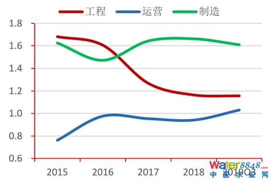 自2017年起,受市場信用收緊環(huán)境影響,各類水企的杠桿率呈明顯上升趨勢,不斷逼近國務(wù)院針對一般工業(yè)企業(yè)杠桿率的指導意見值70%(工程類非工業(yè)企業(yè)為75%),其中工業(yè)類企業(yè)杠桿率明顯高于其他類企業(yè),2019年第三季度達65.40%。