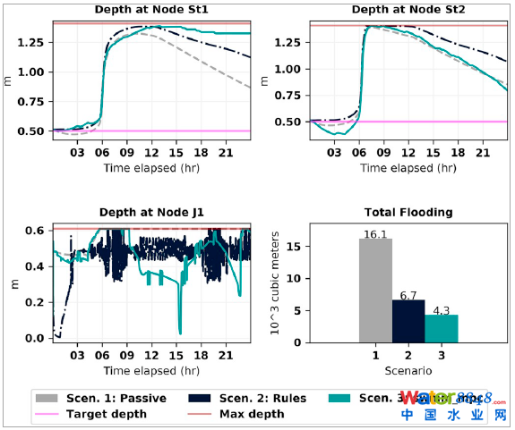本文提供了一種在SWMM模型上實(shí)現(xiàn)模型預(yù)測控制的新思路,通過python二次開發(fā)工具包,結(jié)合遺傳優(yōu)化算法,實(shí)現(xiàn)了城市排水系統(tǒng)模型預(yù)測控制。但該優(yōu)化方法由于需要實(shí)時(shí)演算大量情景,在系統(tǒng)較為復(fù)雜時(shí)就需要大規(guī)模的計(jì)算資源支持。因此,一類更適合城市排水系統(tǒng)實(shí)時(shí)控制的算法仍有待進(jìn)一步開發(fā)。