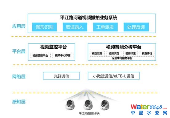 合作達成之后,雙方在平江河上建設了高清視頻監(jiān)控系統(tǒng)。系統(tǒng)的技術架構分為四層:感知層、網(wǎng)絡層、平臺層和應用層。