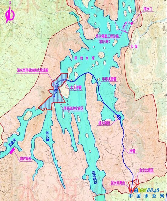 阿哈湖建于1960年,正常庫(kù)容5420萬(wàn)m3。是貴陽(yáng)市城市供水的主要水源地之一。阿哈湖環(huán)保清淤目的是減少湖泊內(nèi)源污染。本底調(diào)查得知淤泥平均厚度39cm,總淤積量130萬(wàn)m3。疏浚采用深水環(huán)保型絞吸挖泥船,并輔助排泥管道、接力泵船將污泥輸送到底泥處置場(chǎng)。環(huán)保絞吸式挖泥船可拆卸、分裝,通過(guò)陸路車(chē)運(yùn)的方式將設(shè)備運(yùn)到施工水域,然后再進(jìn)行水上拼裝。開(kāi)挖設(shè)計(jì)上主要采用密封吸挖、分層開(kāi)挖、限速開(kāi)挖、質(zhì)量監(jiān)控和全封閉輸泥。另外,由于施工不能影響水廠取水,需要對(duì)水廠的取水口進(jìn)行適度保護(hù)。清淤輸出底泥輸送至臨時(shí)堆場(chǎng)進(jìn)行干化處理,然后進(jìn)行資源化利用等處理,同時(shí),余水(即廢水)需要進(jìn)行處理達(dá)標(biāo)后還湖。最后,實(shí)施中需要對(duì)疏浚施工和底泥及余水處理進(jìn)行風(fēng)險(xiǎn)防范。結(jié)合案例,談兩個(gè)關(guān)于河湖清淤的誤區(qū)。