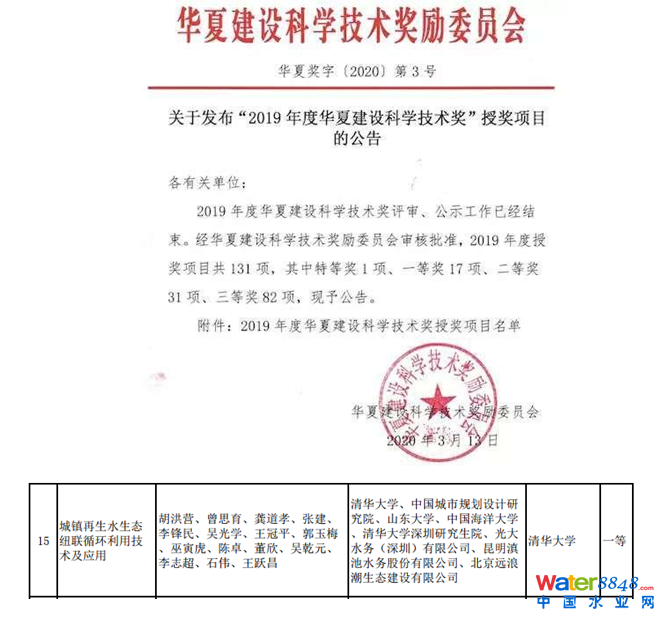 近日,由住房和城鄉(xiāng)建設(shè)部科技與產(chǎn)業(yè)化發(fā)展中心承辦的2019年度“華夏建設(shè)科學(xué)技術(shù)獎(jiǎng)”獲獎(jiǎng)名單相繼揭曉,通過(guò)專業(yè)組和評(píng)審委員會(huì)兩級(jí)評(píng)審,本年度共評(píng)出推薦授獎(jiǎng)項(xiàng)目134項(xiàng),其中特等獎(jiǎng)1項(xiàng)、一等獎(jiǎng)17項(xiàng)、二等獎(jiǎng)32項(xiàng)、三等獎(jiǎng)84項(xiàng)。昆明滇池水務(wù)股份有限公司與清華大學(xué)等校企聯(lián)合申報(bào)的“城鎮(zhèn)再生水生態(tài)紐聯(lián)循環(huán)利用技術(shù)及應(yīng)用”被評(píng)為一等獎(jiǎng)。
