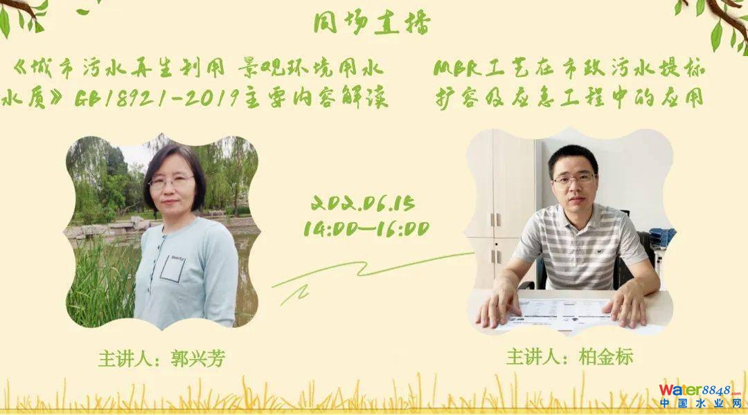 本周一下午14:00—16:00直播:題目:《城市污水再生利用 景觀環(huán)境用水水質(zhì)》GB18921-2019主要內(nèi)容解讀 主講人 :郭興芳,中國(guó)市政工程華北設(shè)計(jì)研究總院有限公司城市環(huán)境研究院  教授級(jí)高工,副總工程師。題目:MBR工藝在市政污水提標(biāo)擴(kuò)容及應(yīng)急工程中的應(yīng)用 主講人 :柏金標(biāo),浙江開創(chuàng)環(huán)?萍脊煞萦邢薰荆贾萸笫悄ぜ夹g(shù)有限公司技術(shù)部經(jīng)理
