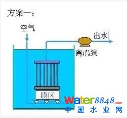 膜組件置于生物反應(yīng)器內(nèi)部,進(jìn)水進(jìn)入膜-生物反應(yīng)器,其中的大部分污染物被混合液中的活性污泥去除,再在負(fù)壓作用下由膜過濾出水。