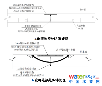 5) 在接縫兩側(cè)填塞遇水膨脹膠條,用模板封堵后,將高壓注漿后發(fā)泡膨脹的灌漿料用灌漿設(shè)備注入到拼接縫內(nèi)。注漿料達(dá)到設(shè)計(jì)強(qiáng)度后拆除模板,在構(gòu)件之間拼接縫臨近水面的凹槽內(nèi)鋪貼防水卷材,并在表面鋪設(shè)防水砂漿保護(hù)層,以防止卷材在水池投入運(yùn)行后被泡起。