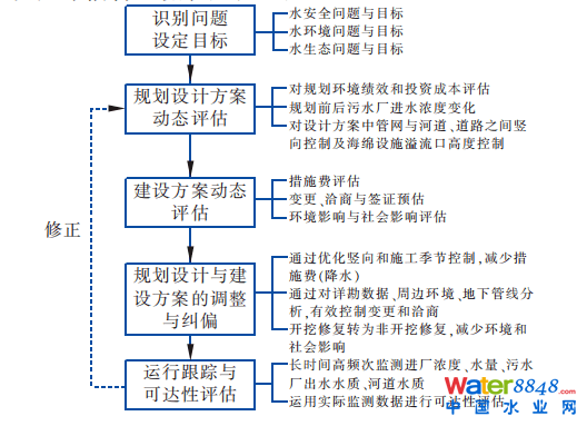 事前規(guī)劃設(shè)計方案評估:規(guī)劃設(shè)計動態(tài)評估是決定其合理性重要依據(jù)。規(guī)劃設(shè)計評估必須建立在滿足績效考核指標要求、落地可行性及最佳投效比基礎(chǔ)上,同時應結(jié)合工程技術(shù)、經(jīng)濟、生態(tài)環(huán)境和社會各方面因素綜合評價,選定最佳方案。對于規(guī)劃方案來講,重點關(guān)注投資成本、管網(wǎng)水位、進廠濃度、出水水質(zhì)和河道水質(zhì)等問題。對于設(shè)計方案,重點關(guān)注道路之間、管網(wǎng)與河道之間、海綿設(shè)施之間的豎向控制問題。