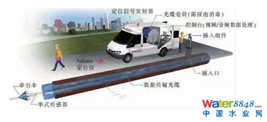 管道漏點修復工作取決且受限于對管道漏點數(shù)量和位置的預判,因此,準確判斷漏點的數(shù)量和位置極為重要。因漏點所在供水管道埋深大,且又位于快速路下,傳統(tǒng)人工聽漏技術無法發(fā)揮作用,因此,選用了Sahara Ⅱ管網(wǎng)檢測新技術,這是一項基于聲學的無損狀態(tài)評估檢測技術,可在不影響管網(wǎng)正常供水運營的狀態(tài)下,通過視頻和聲吶對管道漏損部位進行檢測定位。