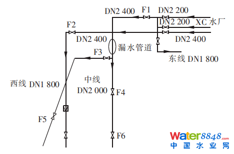 該管道是W市主力在供的XC水廠的出廠管段的一段,其位置如圖2所示。XC水廠共有3根出廠管,一根DN2400(與圖2中其他管段無溝通),兩根DN2200;兩根DN2200管道出廠合并后分為一根DN1800往東線方向,另外一根DN2400先往西,再往南后又繼續(xù)分為中線DN2000和西線DN1800,也是本次出現(xiàn)漏水現(xiàn)象的管道。