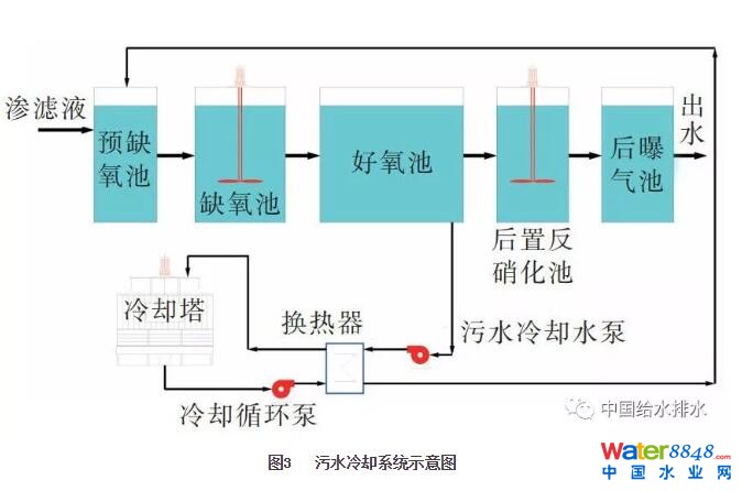 由于高濃度污水在生化反應(yīng)過(guò)程中會(huì)釋放出大量的熱能,同時(shí)由于部分電能轉(zhuǎn)化成熱能的緣故,垃圾滲濾液處理生物池內(nèi)會(huì)保持較高的溫度,過(guò)高的水溫會(huì)抑制微生物的活性,嚴(yán)重時(shí)會(huì)使生化處理系統(tǒng)癱瘓。因此垃圾滲濾液生化處理均設(shè)有污水冷卻系統(tǒng),用污水泵抽取生物池內(nèi)的混合液進(jìn)入換熱器,與冷卻水在換熱器內(nèi)進(jìn)行熱交換,降溫后混合液再回到生物池內(nèi),從而達(dá)到降低生物池內(nèi)水溫的目的。