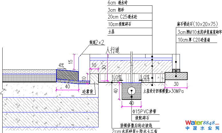 3) 本道路無綠化帶,海綿城市主要是采用透水人行道。將人行道建設成透水結構,人行道與車行道之間采用防滲膜進行隔離。人行道路面結構為:透水磚6cm、中粗砂3cm、透水水泥砼C25 20cm、開級配碎石10cm。