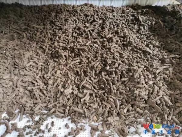 深度脫水后含水率60%左右的污泥在帶式熱泵低溫干化設(shè)備的入口經(jīng)面條機擠壓成約4~6mm直徑的圓柱條狀,再進入網(wǎng)帶連續(xù)低溫除濕干燥箱。在網(wǎng)帶運轉(zhuǎn)污泥緩緩轉(zhuǎn)運過程中,圓柱條狀的深度脫水污泥均勻攤鋪在網(wǎng)帶輸送機上。60~70℃的熱空氣從網(wǎng)帶下方經(jīng)網(wǎng)眼向上通過,使污泥與熱空氣產(chǎn)生熱質(zhì)交換,從而將污泥中水分蒸發(fā)帶出。吸收了污泥中水分的40~50℃濕熱空氣再進入除濕熱泵中進行除濕與加熱處理,處理后熱干空氣循環(huán)對網(wǎng)帶上污泥進行干化,干化后污泥外觀如圖4呈直徑4mm左右的細顆粒狀,干化后污泥含水率降低至40%以下,最后與垃圾摻燒處置。