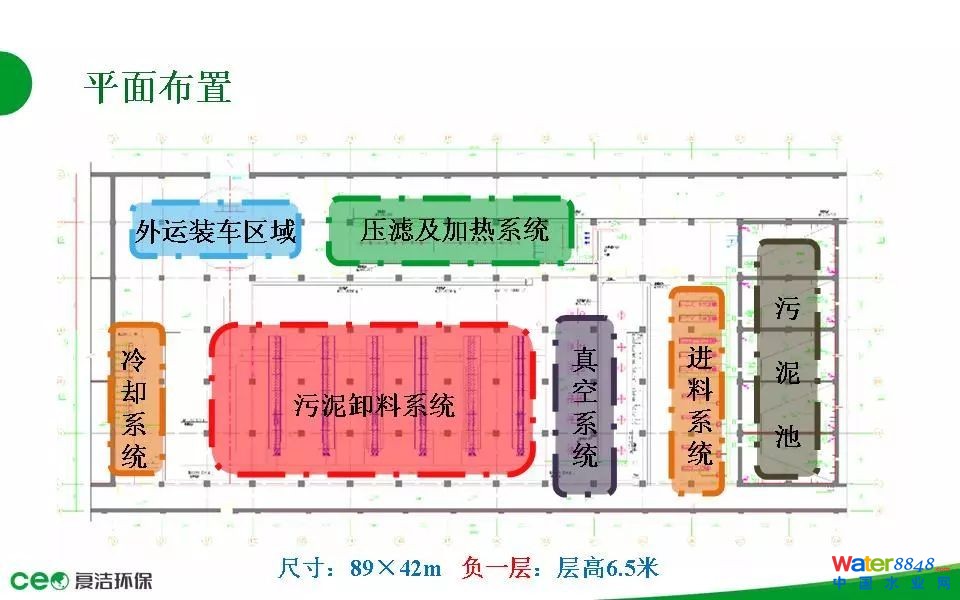 平面布置這塊,我們系統(tǒng)設備地下有一部分,地面上有一部分,地面層整個占地89×42米,層高10.9米,主要有主機部分,污泥濃縮,包括除臭,還有調質以及整個控制間。這是底下層,也就是負一層,占地尺寸是一樣的,底下標高稍微矮一點,大約6.5米。這里面主要包括污泥的卸料系統(tǒng),還有壓濾加熱系統(tǒng),這是我們重點區(qū)域的一些功能。我們整個項目當中采用的BIM做的設計,因為這個項目是地下結構,很多設計包括施工必須要前期考慮的更多,否則后續(xù)的土建和管道沒法進行變更的,所以當時進行了大量的BIM模型設計。