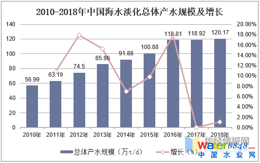 海水淡化作為有效替代天然淡水的途徑,日趨經(jīng)濟(jì)合理。近年來,中國海水淡化工程總體規(guī)模穩(wěn)步增長,2018年中國海水淡化總體產(chǎn)水規(guī)模為120.17萬t/d,同比增長1.05%。