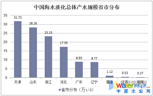 截至2018年底,中國海水淡化項目主要分布在沿海9個省(市),產(chǎn)水規(guī)模排前三的分別為天津、山東、浙江省,產(chǎn)水規(guī)模分別為31.72萬t/d、28.26萬t/d、23.23萬t/d。