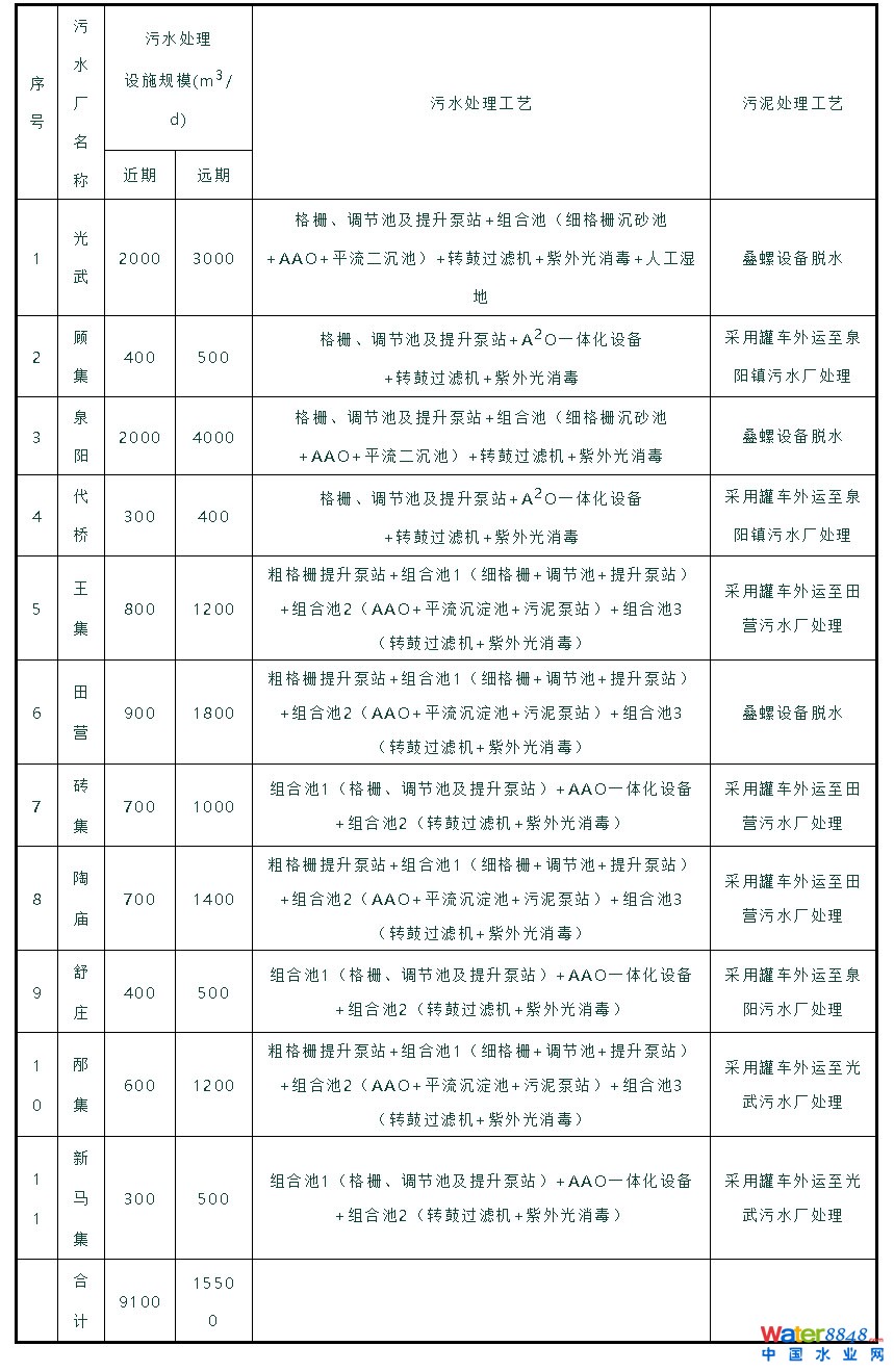 界首市15個(gè)鄉(xiāng)鎮(zhèn)新建11座污水處理廠和4座一體化提升泵站,近期設(shè)計(jì)總規(guī)模為9100m3/d,遠(yuǎn)期設(shè)計(jì)總規(guī)模為15500m3/d,配套污水管網(wǎng)約161.87km,配套接戶管總長(zhǎng)為229.80km。出水滿足《城鎮(zhèn)污水處理廠污染物排放標(biāo)準(zhǔn)》(GB18918-2002)一級(jí)A標(biāo)準(zhǔn)。污泥定期收運(yùn),外運(yùn)處置。