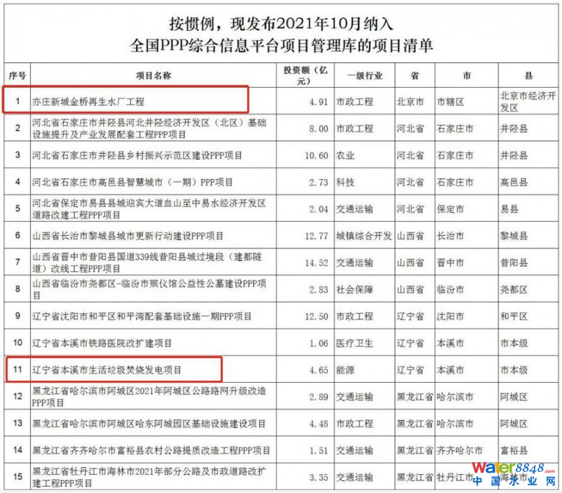 2021年10月75個新入管理庫PPP項目 包括多個污水處理項目