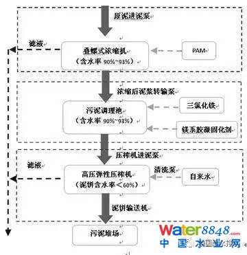 工藝流程簡(jiǎn)介:污水處理廠重力濃縮后含水率98%的污泥通過(guò)泵輸送至污泥調(diào)理池,在污泥調(diào)理池中投加骨架結(jié)構(gòu)體和破胞藥劑,使之與污泥混合均勻,在兩種藥劑協(xié)同作用下對(duì)污泥胞外聚合物進(jìn)行破壞,改變污泥水分分布,從而達(dá)到污泥改性效果。改性后的污泥再用高壓泵輸送至板框脫水機(jī),脫水后得到含水率為60%以下的塊狀泥餅。