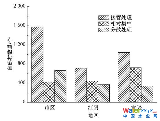 (4)其他模式:水環(huán)境容量大、生活污水處理程度能與當(dāng)?shù)刂饕?jīng)濟(jì)作物灌溉需求相結(jié)合的地區(qū)(陽山鎮(zhèn)桃林模式)就近進(jìn)行資源化利用。至20208月底,市區(qū)、江陰市和宜興市采用接管模式處理的自然村分別為1579、712個和1041個,占各區(qū)各自然村農(nóng)村生活處理比例分別為59.12%46.65%49.45%,具體治理模式情況如圖2所示。隨著無錫市對農(nóng)村生活污水治理力度不斷加大,對入戶管網(wǎng)進(jìn)行排查和完善,農(nóng)村生活污水收集情況總體較好,接管處理和相對集中處理模式能夠較好地接收和處理污水,極少數(shù)小型分散處理設(shè)施收集率較低,存在“曬太陽”現(xiàn)象。