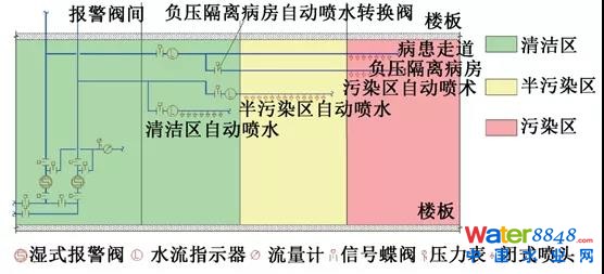 設(shè)計(jì)建議:消防給水管井位置、管道敷設(shè)走向按“疫時(shí)”土建平面設(shè)置,遵循按水流方向經(jīng)清潔區(qū)-半污染區(qū)-污染區(qū)的原則。對(duì)于自動(dòng)噴水滅火系統(tǒng),當(dāng)系統(tǒng)規(guī)模較大時(shí),可按“三區(qū)”各自獨(dú)立設(shè)置報(bào)警閥。圖7是上海某獨(dú)立病房樓“平疫結(jié)合”設(shè)計(jì)中自動(dòng)噴水滅火系統(tǒng)的簡(jiǎn)化系統(tǒng)原理介紹。該系統(tǒng)設(shè)計(jì)遵循水流方向經(jīng)清潔區(qū)-半污染區(qū)-污染區(qū)的原則,在不增加報(bào)警閥數(shù)量的前提下將污染區(qū)、清潔區(qū)和半污染區(qū)從報(bào)警閥開始各自獨(dú)立成兩個(gè)系統(tǒng)。