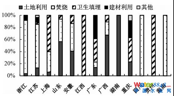 北方地區(qū)污泥處置出路如圖3所示,處置方式較統(tǒng)一,除山西以焚燒為主,其他地區(qū)主要以土地利用為主,部分地區(qū)以填埋為主。